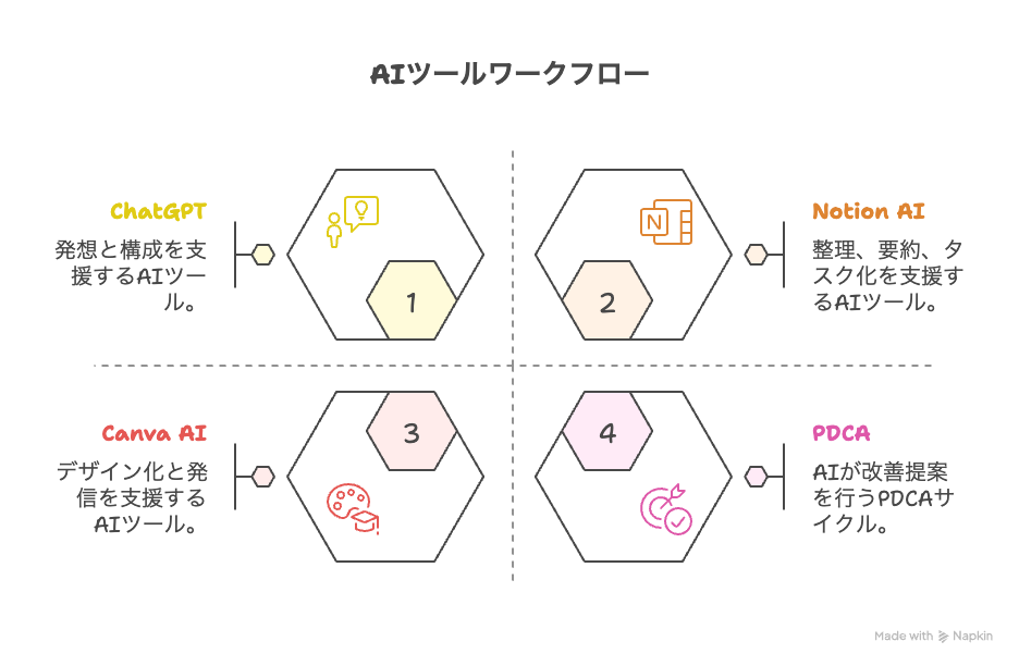 ChatGPTが“思考を深め”、Notion AIが“構造を整理し”、Canva AIが“表現を形にする”。